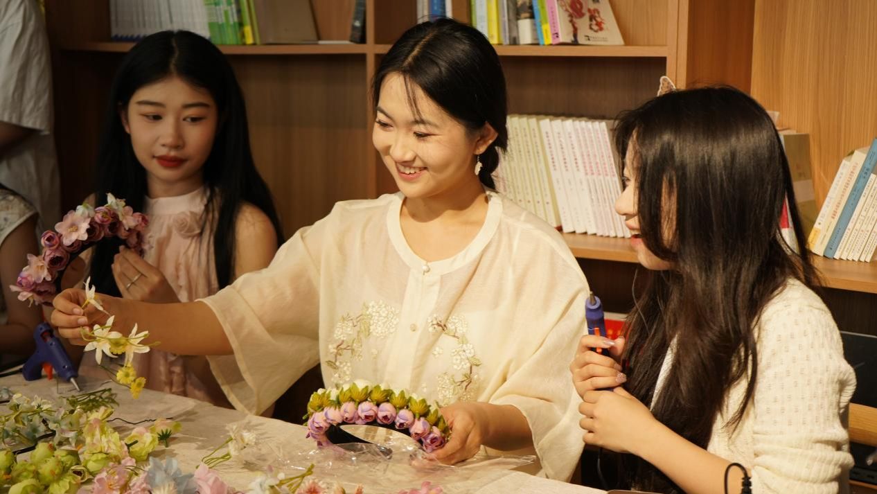 活动开始,社团成员详细介绍了簪花的历史渊源与文化内涵,让同学们对中国传统文化的魅力有了更深刻的认识,在簪花制作环节,同学们充分发挥想象力与创造力,精心挑选花朵、搭配颜色、设计造型,制作出一枝枝独具匠心的簪花作品。同学们在制作过程中互相交流、互相帮助,现场氛围欢乐。